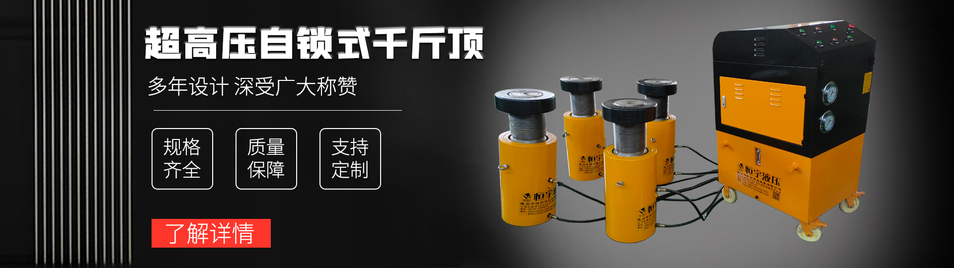 德州市德城區(qū)恒宇液壓機(jī)具有限公司(原德州恒宇液壓機(jī)具廠(chǎng))是液壓千斤頂、超高壓泵站、超高壓大流量柱塞泵、PLC智能同步頂升系統(tǒng)油缸及整套液壓系統(tǒng)的專(zhuān)業(yè)生產(chǎn)商服務(wù)商,擁有超高壓液壓千斤頂核心生產(chǎn)技術(shù)的生產(chǎn)經(jīng)驗(yàn)和研發(fā)團(tuán)隊(duì)!產(chǎn)品品種涵蓋:液壓千斤頂、頂管機(jī)千斤頂、超高壓手動(dòng)泵、超高壓電動(dòng)泵、液壓中心架、徑向柱塞泵、軸向柱塞泵、成套液壓系統(tǒng)設(shè)備及各種高低壓液壓缸。也可根據(jù)客戶(hù)的要求定制液壓系統(tǒng),液壓千斤頂。我公司技術(shù)力量雄厚,千斤頂檢測(cè)設(shè)備齊全,產(chǎn)品質(zhì)量穩(wěn)定可靠,售后服務(wù)周到,千斤頂?shù)母黜?xiàng)技術(shù)指標(biāo)均接近或達(dá)到國(guó)際水平。恒宇液壓作為高品質(zhì)液壓產(chǎn)品的提供者,不斷創(chuàng)新研···